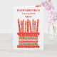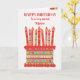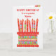 Vous pouvez ajouter l'âge à cette carte d'anniversaire aux couleurs vives pour votre nièce, avec un gâteau d'anniversaire de fraise. Le gâteau a beaucoup de bougies avec différents motifs et il y a une bande à motifs autour du gâteau avec des fruits d'été colorés - fraises, framboises, citron vert et tranches d'orange. Au-dessus du gâteau, l'accueil, en lettres rouges, est "HEUREUX ANNIVERSAIRE à une nièce très spéciale" et sur le gâteau, il y a un espace pour ajouter l'âge, suivi par "ans today !" en lettres blanches. N'hésitez pas à customiser le message intérieur si vous le souhaitez ; vous pouvez changer la police et la couleur ainsi que le message.