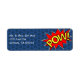 Superhero Comic Buch "POW!" Klangeffektblase. Dieses Design zeichnet sich durch das vertraute Aussehen einer roten Spiky-Blase mit schwarz gepunkteten Schatten aus. "POW!" in einer zweifarbigen gelben Füllung mit einem leichten schwarzen Schatten, um das Wort Pop zu machen, mit einem dunkelblauen gepunkteten Muster auf blauem Hintergrund.