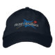 Cooles Schlagzeug bestickt Hut - gemacht nur für Front-Ensemble-Spieler! Auch gemeinhin als "die Grube" bezeichnet. Auf einem hellblauen "kapow!"-Schild steht "Front Ensemble", vor dem eisblaue Buchstaben mit schwarzer Kontur geschrieben sind. Im Hintergrund ist ein rotes Garnballett eingeklemmt. Perfekt für jeden, der Band oder Drum Corps marschiert. Alle Designs sind Copyright © Kamikaze Schlagzeug.