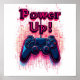 Ein schwarzer Videospielcontroller mit roten Akzenten wird auf einem weißen Hintergrund dargestellt. Der Controller befindet sich in der Bildmitte, mit dem Satz "Power Up!" in pixelig, rosa Buchstaben darüber. Der Hintergrund zeichnet sich durch ein stilisiertes Leiterplattenmuster in Rosa und Blau aus, das eine kraftvolle und dynamische Atmosphäre schafft.
