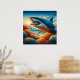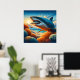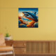 Ein Gemälde eines großen weißen Hais, das seine räuberische Natur zeigt, indem er einen Fisch in seinen scharfen Zähnen gefangen nimmt und eine heftige und dramatische Unterwasserszene darstellt.