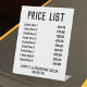 Stehendes Preisschild für Friseursalon oder Friseursalon. Verändern Sie die Preise, wie Sie wollen. Zeigt bis zu 9 Artikel und Preise an. Schwarz und Weiß. Weißer Hintergrund.