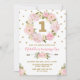 Invitation à l'anniversaire, sucrée et fillette, avec une couronne florale couleur rose et bleu et des confettis dorés.