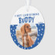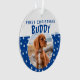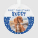 Premier Noël Blue Star Motif Chien Chien Chien Chien Chien Photo Ornement. L'arrière - plan est bleu avec des étoiles blanches. Personnalisez l'ornement avec la photo, le nom et l'année de votre chien. Vous pouvez l'utiliser pour n'importe quel animal de compagnie. Un grand souvenir de vacances pour vous ou un cadeau pour votre famille et vos amis.