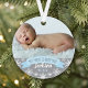 La bannière "My First Christmas" et le design de décoration de la photo de la frontière avec flocon de neige peuvent être personnalisés avec le nom du bébé garçon et l'année de naissance. Inclut une deuxième photo à l'arrière. Couleurs bleu clair, gris et blanc.