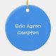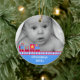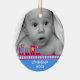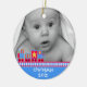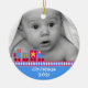 Le premier ornement de Noël de bébé doux fait d'une céramique ronde avec un joli cordon d'or. Graphiques d'un train de jouets coloré bordant un arrière - plan bleu, au bas de l'ornement, et une photo personnalisée, au haut de l'ornement. Le texte blanc sur la zone bleue inférieure et sur l'arrière est entièrement personnalisable. Personnalisez tout le texte et la photo de votre bébé, pour un doux premier Noël ou comme un cadeau de beauté pour les nouveaux parents ou grands-parents.