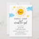 Carte d'invitation de 1er anniversaire mignonne avec aquarelle illustration d'un soleil souriant. Le texte dit "premier voyage autour du soleil !" Ça marche pour la fête d'anniversaire de garçon et de fille.