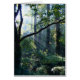 Des rayons blancs brillants du soleil matinal jaillissent de branches sombres vers une forêt estivale verdoyante, avec des arbres massifs recouverts de lierre et des pinces fertiles.