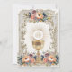 Célébrer le sacrement de la première sainte communion est une occasion merveilleuse. Cette invitation traditionnelle catholique vintage à la première communion traditionnelle présente une belle image du Chalice et de l'Hôte, l'Eucharistie sur un cadre doré orné, accentué d'un design floral. Tous les textes et polices peuvent être facilement modifiés.