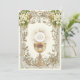 Célébrer le sacrement de la première sainte communion est une occasion merveilleuse. Cette invitation traditionnelle catholique vintage à la première communion traditionnelle présente une belle image du Chalice et de l'Hôte, l'Eucharistie sur un cadre doré orné, accentué d'un design floral et or blanc. Tous les textes et polices peuvent être facilement modifiés.