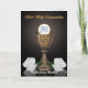 Image et illustration composition du calice doré sur roses blanches, noires et texte pour l'invitation du parti de la Première Communion de l'enfant