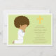 Invitation de la Première Sainte Communion Verte montrant un garçon afro-américain agenouillé sur la gauche, croix jaune avec les détails de la Communion ou du parti sur la droite en marron.