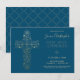 Cette première invitation de communion sainte moderne comporte une croix complexe de style "feuille d'or" (simulée) et les mots "Première sainte communion" dans une police moderne. L'arrière - plan est de couleur turquoise bleue, mais peut être customisé à n'importe quelle couleur de votre choix.