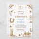 Célébrez la journée spéciale de votre petit cowboy avec cette charmante invitation pour son premier rodéo ! Parfaite pour un anniversaire à thème rodéo pour un enfant de 1 an, cette invitation présente des dessins amusants inspirés de l'Ouest et des éléments de cowboy ludiques qui donnent le ton pour une célébration mémorable. Facile à personnaliser avec le nom de votre enfant, la date et les détails de la fête, cette invitation est un must pour les parents qui prévoient un anniversaire à thème cowboy. Sellez et préparez-vous pour une journée remplie de plaisir, d'amis et d'excitation de rodéo !