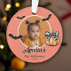 Premier Ornement en verre photo Citrouille de chauves-souris d'Halloween pour bébé. Un nom de bébé personnalisé dans un script tendance, citrouilles orange et chauves-souris noires. Personnalisez l'ornement avec la photo, le nom et l'année de votre bébé. Une belle tenue de vacances Halloween.
