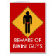La silhouette d'un homme dans un bikini rouge sur un signe en forme de diamant jaune et le texte prennent garde des types de bikini.