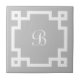 Ein weißer griechischer Tastenrahmen legt ein Monogramm in einem Schriftart mit weißem Skript auf grauem Hintergrund. Anpassen Sie es einfach mit Ihrem eigenen Initial. Auch macht ein großartiges personalisiertes Haus Erwärmung Geschenk!