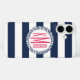 Dress your phone for a trip on a yacht with this sweet nautical monogram case. Das Design zeichnet sich durch breite marineblau-weiße Streifen aus, die mit Ihrem dreiteiligen Monogramm in Rosa, umgeben von einem kreisförmigen Seil-Abzeichen, versehen sind.