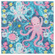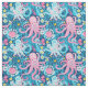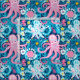 Ein nahtloses, von Hand gezeichnet Muster mit rosa und weißen Oktopusfarben, umgeben von weißen, blauen und gelben Blumen, Set gegen den tiefblauen Meeresboden. Das Design verbindet skurrile Meereslebewesen mit lebendigen Blumenelementen und schafft so eine charmante und lebendige Unterwasserszene.