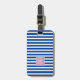 Gepäckanhänger mit pastellfarbenem Hintergrund in beliebiger Farbe mit Streifen und einem dreiteiligen Monogramm auf einem blütigen Monogramm-Halter. Auf der Rückseite befinden sich die Informationen in einem serifenlosen Schriftart auf weißem Hintergrund.