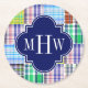 Preppy Patchwork Madras Navy Quatrefoil Monogram Runder Pappuntersetzer