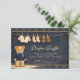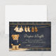 A charming preppy baby shower design featuring a sweet teddy bear dressed in a classic green plaid jacket and bow tie. Above the bear, a delicate clothesline displays tiny baby clothes and shoes, creating a nostalgic storybook nursery scene. The deep navy background and subtle tartan border add a refined, vintage-inspired touch that feels both elegant and playful. Perfect for a stylish baby shower celebration with a classic preppy aesthetic.