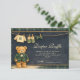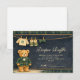 Ein charmantes, vornehmes Baby-Shower-Design mit einem süßen Teddybären, der eine klassische grüne Karo-Jacke und eine Fliege trägt. Über dem Bären zeigt eine zarte Wäscheleine winzige Babykleidung und Schuhe und schafft eine nostalgische Szene aus einem Bilderbuch-Kinderzimmer. Der dunkelblaue Hintergrund und der subtile Tartan-Rahmen verleihen dem Ganzen eine raffinierte, vintage-inspirierte Note, die sowohl elegant als auch verspielt wirkt. Perfekt für eine stilvolle Baby-Shower-Feier mit klassischer, vornehmer Ästhetik.