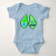 Ce t-shirt bébé mignon présente une image graphique d'une cosse de pois verte contenant 2 pois verts et un gros pois bleu. Le gros pois bleu a un petit visage mignon avec des yeux et une bouche. De l'autre côté de la cosse de pois, en texte bleu foncé, il est écrit "Bébé garçon prêt à faire caca".