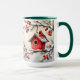 A beautiful Christmas coffee mug with a vintage cardinal sitting on a pine branches covered in snow and red berries.