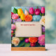 Beautiful and colorful tulips, roses and hydrangeas highlight this personalized text box event acrylic sign.