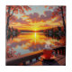Ceramic tile with a pretty illustration of a sunrise in the morning overlooking a lake view at a lake houses with a cup of warm coffee sitting on the ledge.