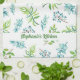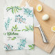 Cute, personalized kitchen towel in a pretty, blue and green watercolor floral design.