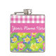 Eine hübsche Hip Flask für Sie, mit einem Muster aus rosa, gelben und blauen Primrosen, kombiniert mit passendem rosa Band, wo Sie Text hinzufügen können, wenn Sie möchten; Teil der Posh & Painterly 'Primroses' Kollektion.