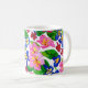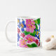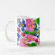Eine klassisch weiße 11 oz Tasse mit einem überallten, handbemalten Muster aus rosa und blauen Primaten. Mikrowellen- und spülmaschinenfest. Siehe auch passende Grußkarte, Geschenke und Kleidung.