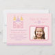 Una invitación elegante de la fiesta real para su pequeña princesa! Incluye un castillo, un espacio para una fotografía de su hijo, y un texto personalizado. Los colores son de color rosa, púrpura, amarillo y blanco. La púrpura de la lila y el modelo de vestido blanco de los guisantes en la parte posterior de la tarjeta.