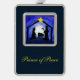 Krippe auf einem dunklen Hintergrund. "Prinz des Friedens" unten.