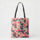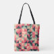 Dieses Bild ist ein geometrisches Muster, bestehend aus Dreiecken und Chevronen, in einem Gitter angeordnet, mit einer lebhaften Mischung aus abgestuften Farben wie Korallenrosa, sanftem Pfirsich, Salbei grün und Holzkohle schwarz. Das Design verwendet Symmetrie und Rotation und erzeugt einen visuell ansprechenden, tessellierten Effekt. Formen wie Pfeile, Diamanten und Chevronen scheinen sich zu vermischen und zu verschließen, was das Muster dynamisch und modern macht
