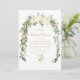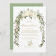 Eine florale, naturfarbene Garage aus elfenbeinfarbenen weißen Blume und grünem Blattwerk mit elegantem Schriftzeichen.