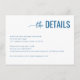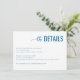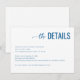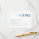 This wedding enclosure card features a clean, minimalist design with ample white space, creating an elegant and professional look. The color palette includes deep navy blue for the main text and lighter shades of blue for secondary details, complemented by simple black serif font for readability. The typography combines cursive script for "the" and bold uppercase sans-serif for "DETAILS," adding a touch of sophistication. Perfect for conveying essential event information in a formal yet approachable manner, this card is ideal for weddings or upscale events.