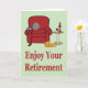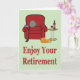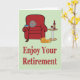 Profitez de votre carte de retraite La carte idéale pour tous ceux qui sont sur le point de prendre leur retraite. Composé d'un fauteuil rouge confortable, d'une table de chevet avec une bouteille et un verre de vin rouge et d'un chat posé sur le sol à côté de la chaise, il donne une image chaleureuse et cosy. Le tout posé sur un arrière - plan vert pastel avec le message simple "Profitez de votre retraite" en rouge. Mettez votre propre message spécial de retraite à l'intérieur. Visitez notre magasin pour plus de grands designs