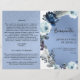 Elegante programa de quinceañera con hermoso arreglo floral en acuearela en varios tonos de azúl y detalles en imitación de Aluminio azul. Uso de elegante caligrafía moderna. Nuestro texto es solo un ejemplo, ya que puedes agregar cualquier información o mensaje que prefieras. Puedes hacer agereches de tamaño de texto, color y estilo seleccionando "seguir personalizando". NOTA: Este programa es enviado plano y REQUIERE QUE LO DOBLE MANUALMENTE en casa. Se recomienda el tipo de papel seleccionado por krankñador. Invitación que Coordina disponible. Este mismo programa esta disponible también en Inglés. Parte de nuestra colección "Elegant Blue Watercolor Floral Quinceañera", con variedad de productos para corar disponibles.