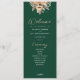 Dunkelgrünes Hochzeitsprogramm mit Aquarell-Blume und Gartenblättern. Ein schlichtes, aber elegantes zeitgenössisches botanisches Design, inspiriert mit boho Vintagen Stil, mit Monogramm auf der Rückseite.