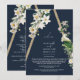 Une belle pyramide de bois rustique de style bohème avec des flancs d'aquarelle blancs en cascade sur le côté et un arrière - plan bleu. Un design unique qui utilise des plantes vintages d'aquarelle blanche sur une structure triangulaire bohème. Un charmant design floral blanc aux caractéristiques rustiques et géométriques et à l'élégante typographie de script. Un design élégant de carte d'itinéraire de mariage avec des éléments modernes. Des invitations de mariage et d'autres articles de papeterie sont également disponibles.