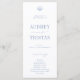 CAPE COD Coastal Blue, programme de mariage. Caractéristiques, typographie bleu clair et coquillage de coquillages à coquilles Saint-Jacques illustration sur le devant avec typographie blanche et support arrière - plan bleu marine poussiéreux.