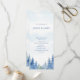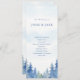 Ce programme de mariage présente une aquarelle bleue tranquille avec une silhouette de forêt brumeuse le long de la bordure inférieure. L'arrière - plan en dégradé doux passe du bleu doux au sommet à un centre blanc propre, créant un effet paisible et élégant. La disposition est moderne et épurée, en utilisant une police serif classique en bleu pour tout le texte. Le devant affiche les noms du couple et un ordre clair de cérémonie. Le verso liste la fête de mariage, y compris le célébrant, les parents, la bonne d'honneur, le meilleur homme, les demoiselles d'honneur, les groomsmen, la fille de fleurs, et le porteur de bague. Un message de remerciement sincère du couple est inclus en bas. Cette carte double face est idéale pour les mariages de bois, d'hiver ou de plein air, offrant un look sophistiqué et apaisant.