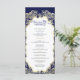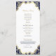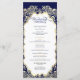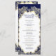 Cette carte de programme de mariage présente un design minimaliste en bleu marine et or classique. L’avant met en évidence les noms du couple dans un cadre doré dressé contre un arrière - plan de la marine profonde, donnant une touche formelle et sophistiquée. La page arrière présente l'ensemble des détails mariages dans un agencement propre et moderne agrémenté de subtils reflets dorés. L'association intemporelle de bleu marine et d'or chatoyant crée un design élégant et distingué, parfait pour des cérémonies formelles et des papeteries de garde.