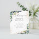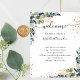 Arrière - plan blanc élégant, décoré de verdure d'eucalyptus, de feuillage doré et de poussière de parties scintillant en faux or. Personnalisez et ajoutez vos noms et votre calendrier de mariage.