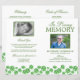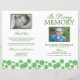 Programme funéraire irlandais budget avec un arrière - plan blanc traditionnel, des trèfles d'aquarelle verte, une photo de votre être cher perdu, les détails funéraires, une nécrologie, l'ordre de service, les détails de la veillée, une autre photo sur la page arrière, et une note de remerciement personnalisée. REMARQUE : Ceux-ci viennent comme un morceau plat de papier de qualité, vous aurez besoin de les plier vous-même.