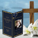Un programme élégant de 4 pages. Un fond bleu foncé, un cadre en faux or, des fleurs bleues et un espace pour votre photo sur la couverture. Personnalisez et ajoutez le nom, les dates et votre texte.