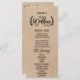 Ce programme de mariage mémorial calligraphié kraft rustique est parfait pour un mariage tendance. Le design présente une typographie amusante écrite à la main avec des boucles et des volutes charmantes entourées d'une simple couronne de branches d'olive. Incluez le nom de la mariée et du marié, la date et le lieu du mariage, un message de remerciement, l'ordre du service et le cortège nuptial ainsi qu'un mémorial pour les proches.